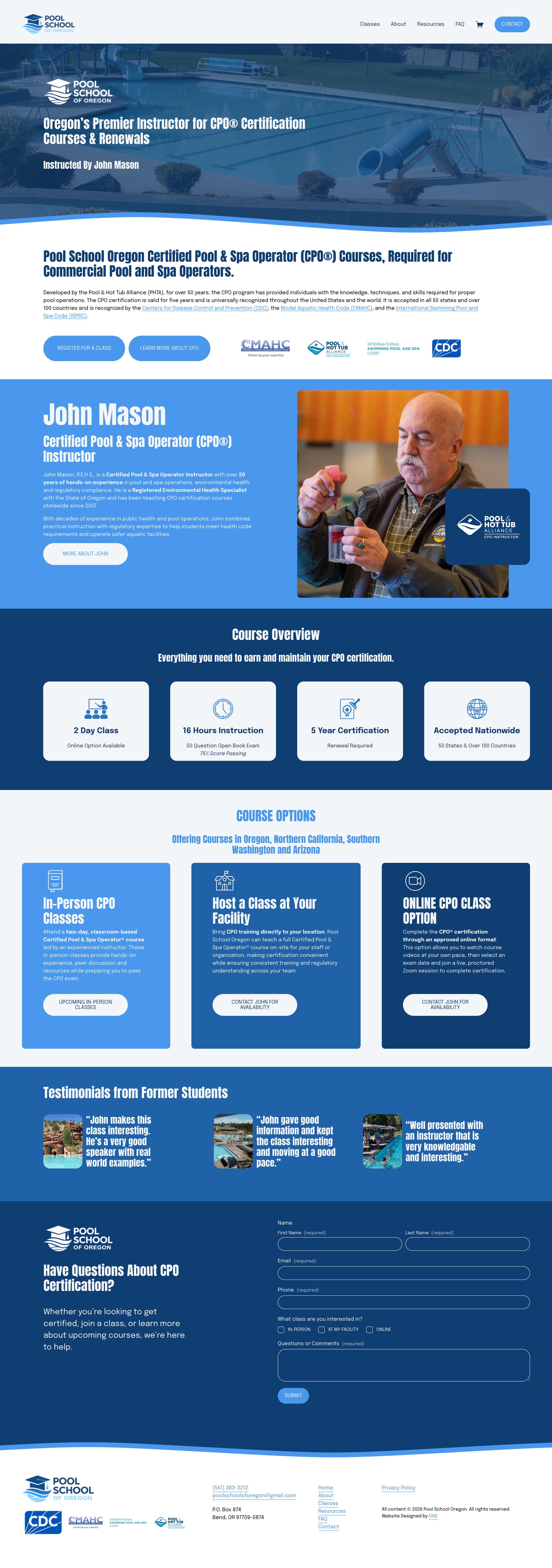 Pool School of Oregon provides Certified Pool & Spa Operator (CPO®) certification and renewal courses for pool professionals, facility operators, and health-department–regulated facilities across Oregon and the Pacific Northwest. As the program grew, there was a need for a dedicated website that clearly explained the certification process, highlighted instructor expertise, and made it easy for students and organizations to take the next step.